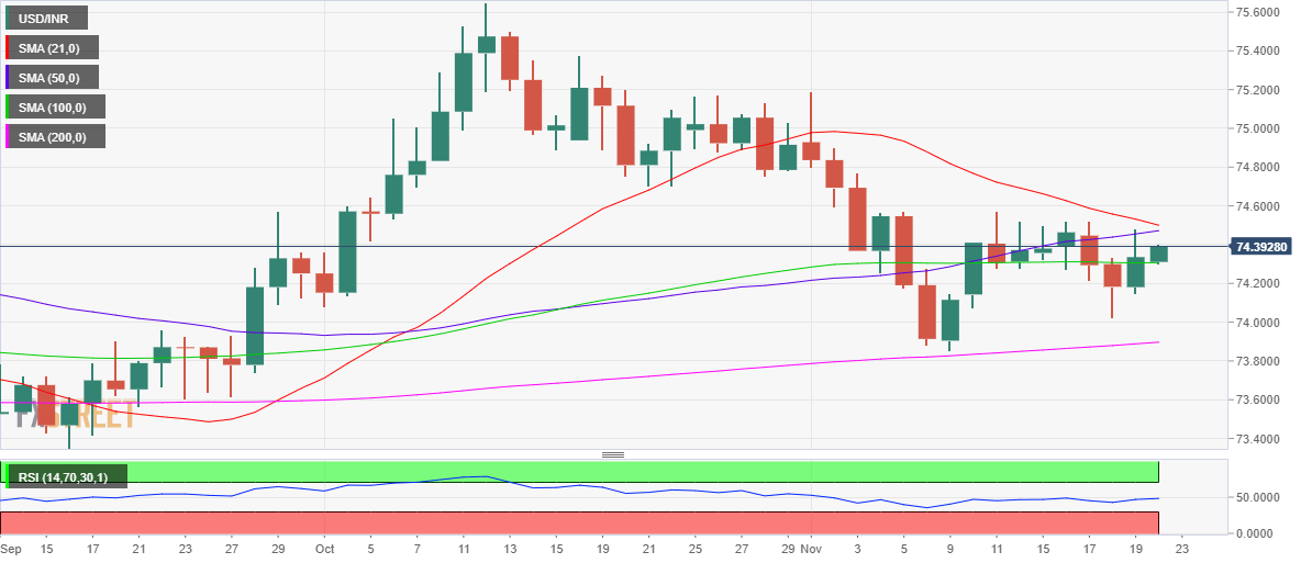 Technically, USD/INR seems to have found acceptance above the 100-Daily Moving Average (DMA) at 74.30, extending its recovery from weekly lows of 74.02.