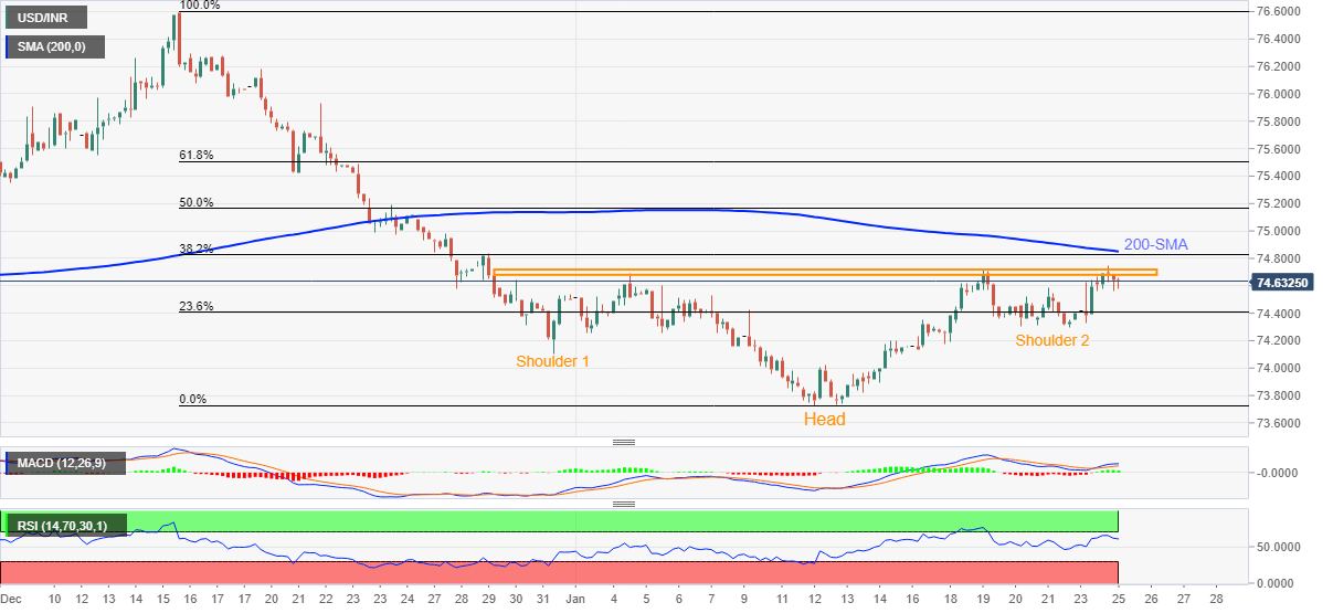 USD/INR Price News: Inverse H&S keeps Indian rupee sellers hopeful below 75.00