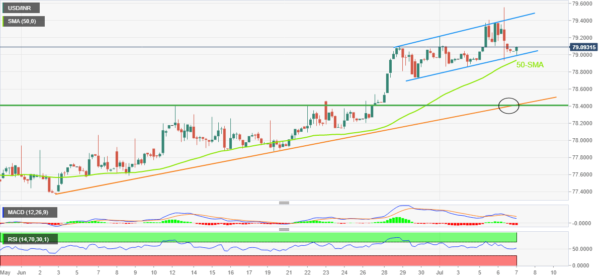 Alternatively, 79.10 and the aforementioned channel’s upper line, near 79.45 could challenge USD/INR buyers on their way to refreshing the record high with the 80.00 threshold.