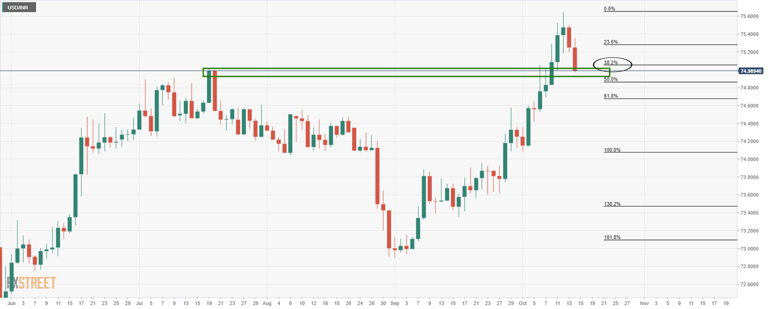 - USD/INR is meeting the 38.2% Fibonacci as the greenback sinks to fresh lows.