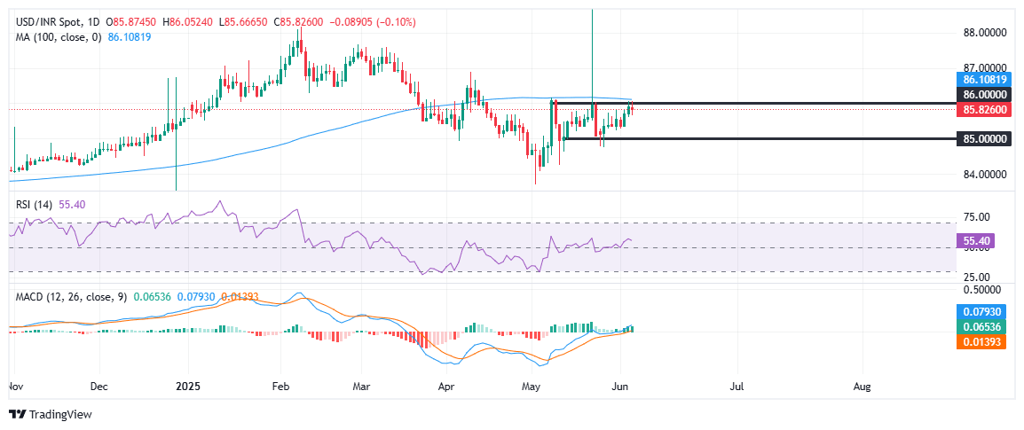 The USD/INR pair remains stuck in a tight range, with price action consolidating between key support at 85.00 and resistance near the 86.00 handle. Thursday’s pullback from the intraday high of 86.05 highlights the pair’s failure to sustain upside momentum, keeping it pinned below the 100-day Simple Moving Average (SMA) at 86.10.