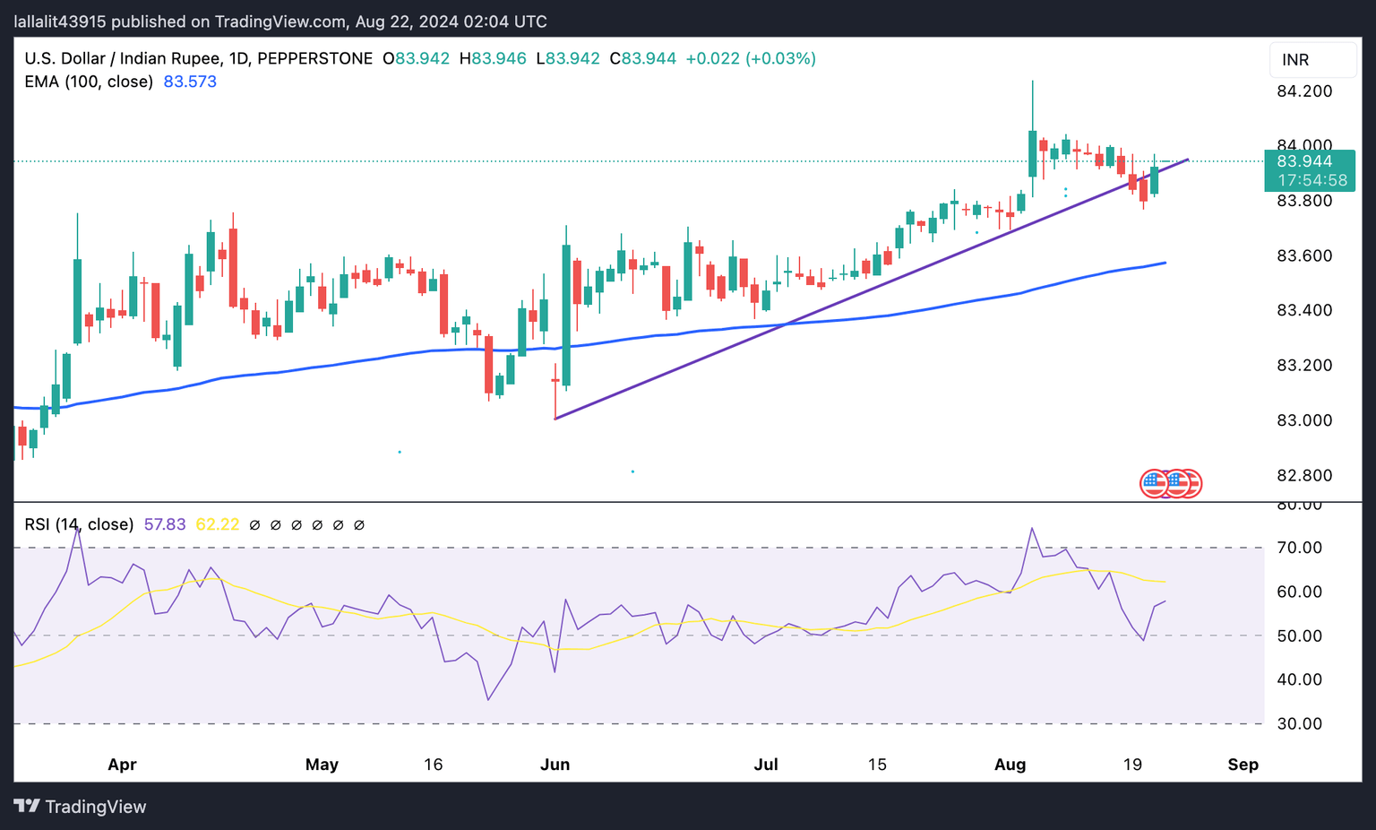 Indian Rupee edges lower on the day. The USD/INR keeps the bullish environment on the daily timeframe as the price is well-supported above the key 100-day Exponential Moving Average (EMA). The pair bounces back above the 11-week-old uptrend line, while the 14-day Relative Strength Index (RSI) points higher above the midline again, indicating there could still be room for further upward movement before the market potentially encounters resistance.