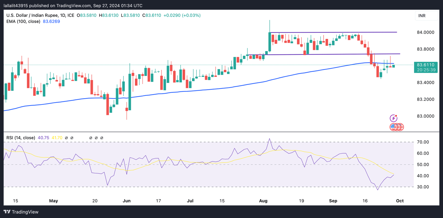 The low of September 23 acts as an initial support level for USD/INR. Sustained trading below this level could lead the pair to drop to 83.00, representing the psychological level and the low of May 24.