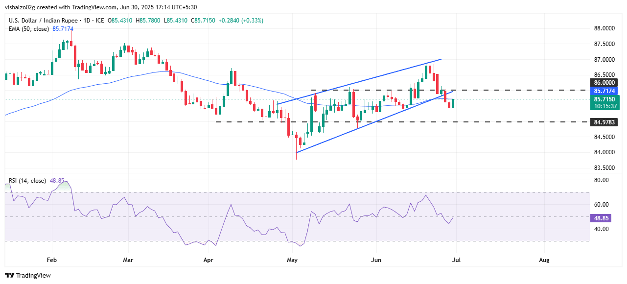 USD/INR is trading around 85.71 on Monday, testing the 50-day EMA near 85.72, after bouncing off a key support level at 85.50. The pair briefly dipped below this zone but failed to sustain the move, triggering a mild intraday reversal.