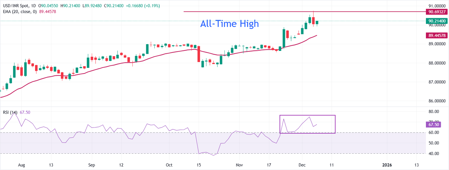 USD/INR rises to near 90.25 on Friday. The pair corrected on Thursday after posting a fresh all-time high around 90.70.