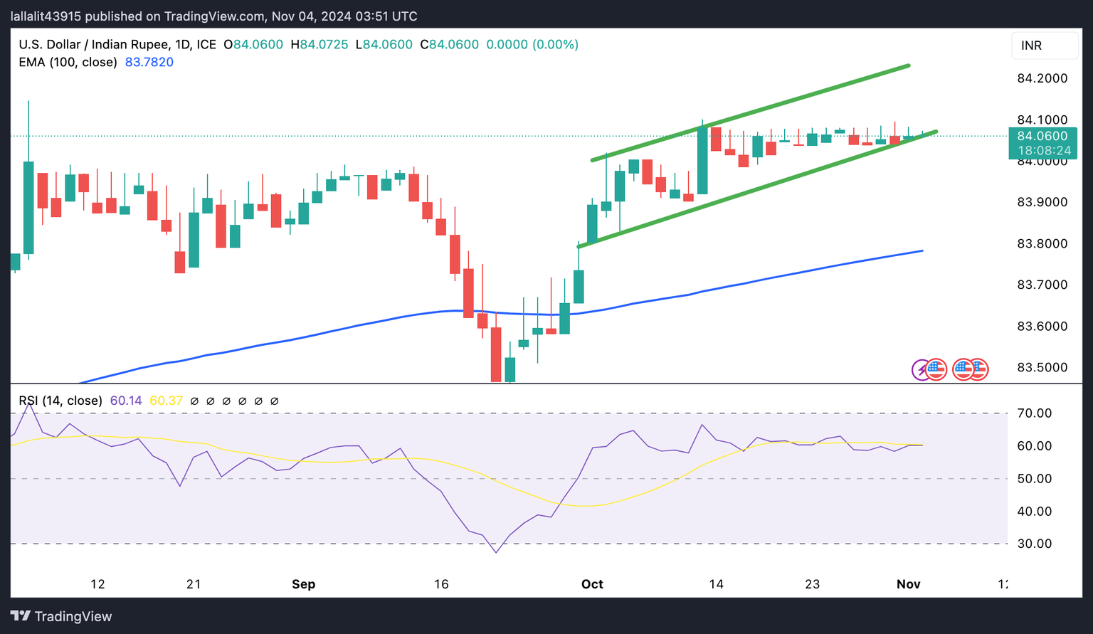 The Indian Rupee trades weaker on the day. However, the bullish outlook of the USD/INR pair remains intact, with the price holding above the key 100-day Exponential Moving Average (EMA). The upward momentum is reinforced by the 14-day Relative Strength Index (RSI), which stands above the midline near 57.70.