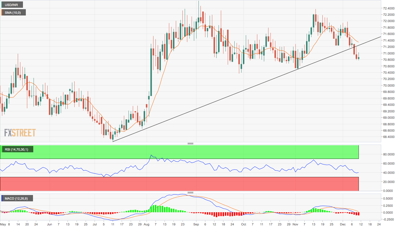 USD/INR has breached a five-month uptrend line and could bring in deeper support levels into play with the daily chart indicators reporting bearish conditions.