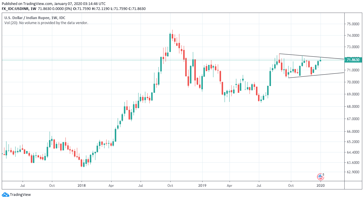 USD/INR remains trapped in a contracting triangle on the weekly chart.
