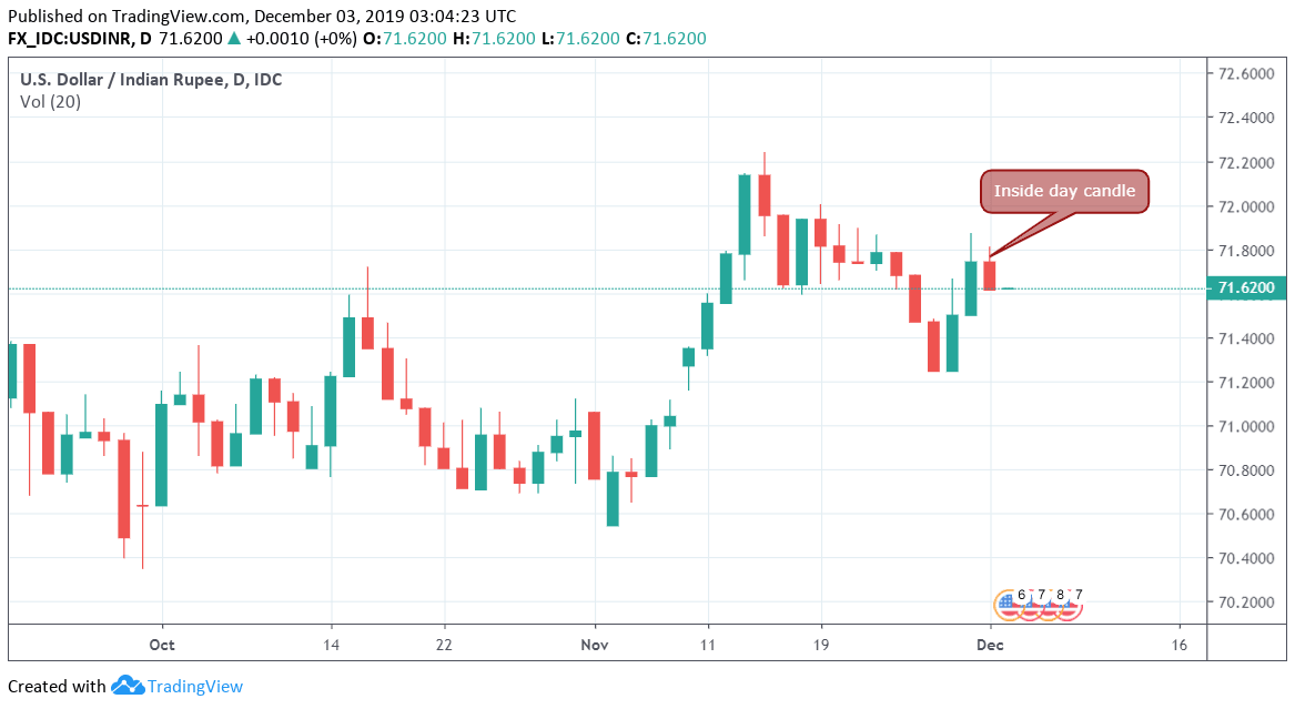 USD/INR created an inside day candlestick pattern on Monday, signaling indecision in the market place.