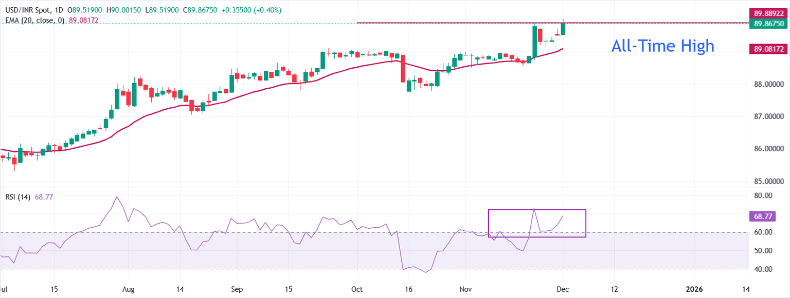 On Monday, USD/INR posts a fresh all-time high near 90.00. The 20-day Exponential Moving Average (EMA) rises and sits at 89.0823, keeping the pair biased higher as price holds above it. Dips could be contained by this dynamic support. RSI at 68.85, near overbought, underscores firm bullish momentum.