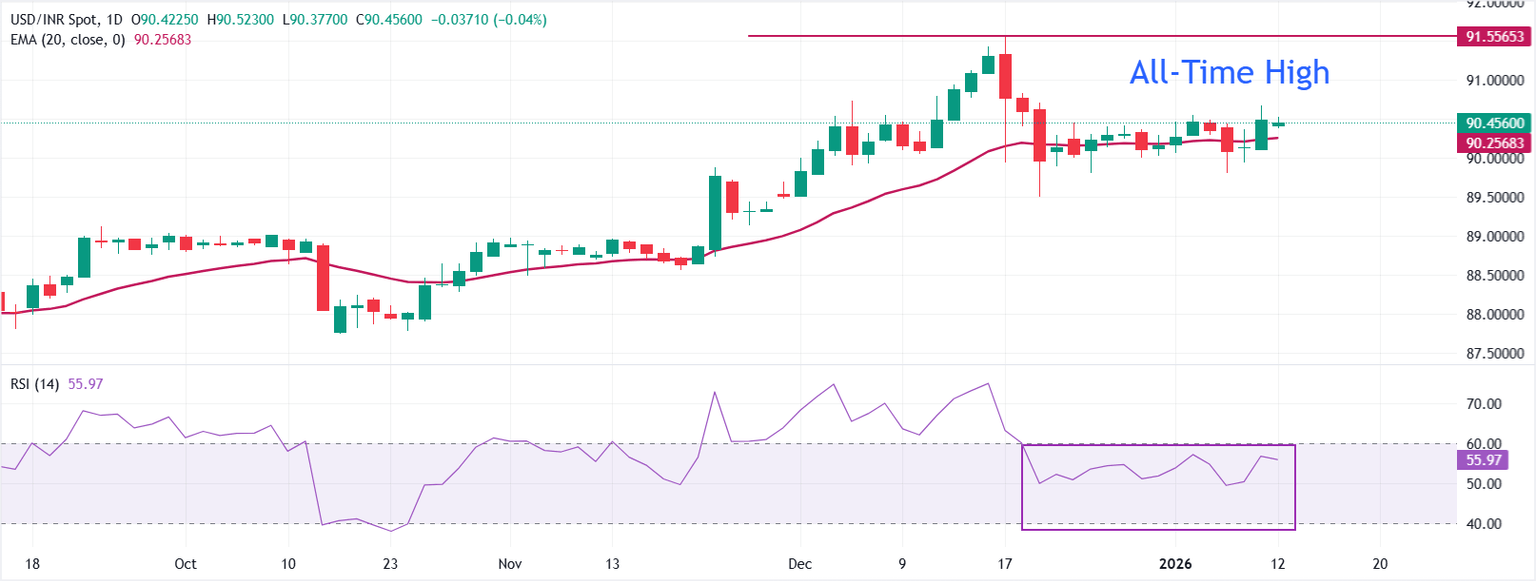 In the daily chart, USD/INR trades slightly lower at 90.4665. Price holds above the rising 20- Exponential Moving Average (EMA) at 90.2578, keeping the short-term bias skewed to the upside as the average edges higher.