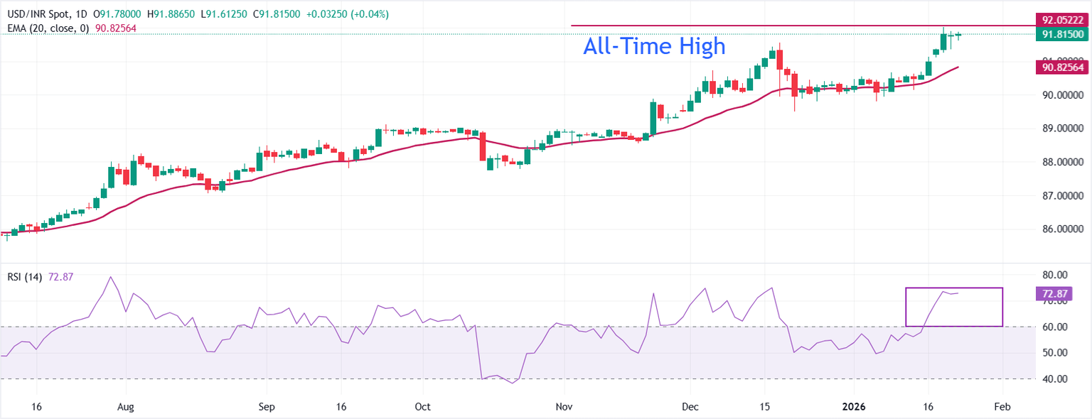 USD/INR trades firmly at 91.8115 as of writing. The 20-day Exponential Moving Average (EMA) trends higher at 90.8253 and underpins the advance. Price holds above this rising 20-day EMA, keeping the near-term bias upward.