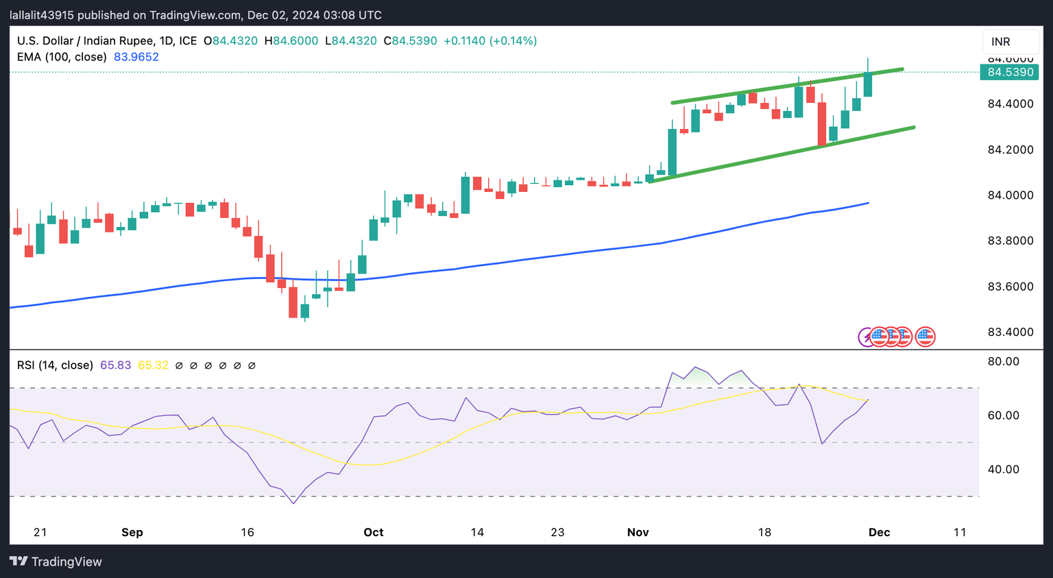 Bullish candlesticks and sustained trading above the ascending trend channel at 84.55 could lead USD/INR to the 85.00 psychological mark.