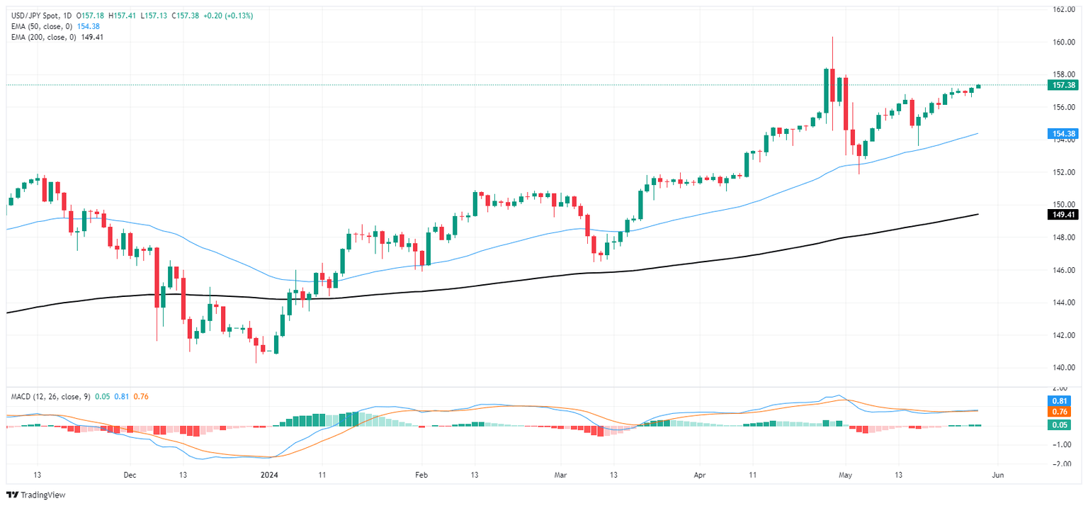 USD/JPY continues to drift into the top end, approaching the 158.00 handle after closing in the green for all but four of the last 17 consecutive trading days. Bullish pressure is keeping the pair pinned deep in bull country, trading firmly on the north side of the 200-day Exponential Moving Average (EMA) at 148.89.