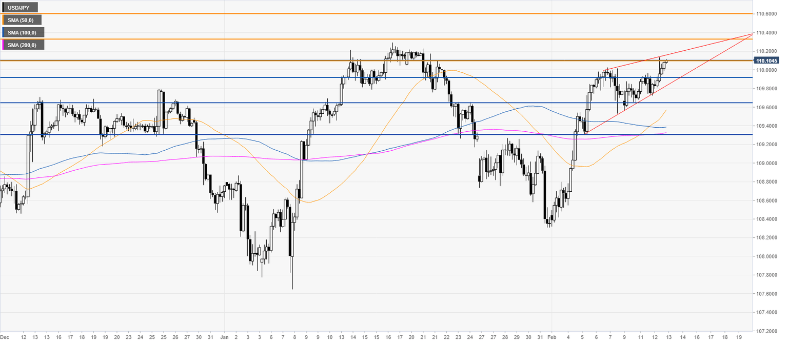 USD/JPY is trading in a rising wedge while above the main SMAs. The spot is challenging the 110.10 resistance and bulls want to break above it to reach January highs near the 110.34 level. A break above the January highs can lead to an acceleration towards the 110.60 level. Support is seen at the 109.92, 109.65 and 109.30 levels, according to the
