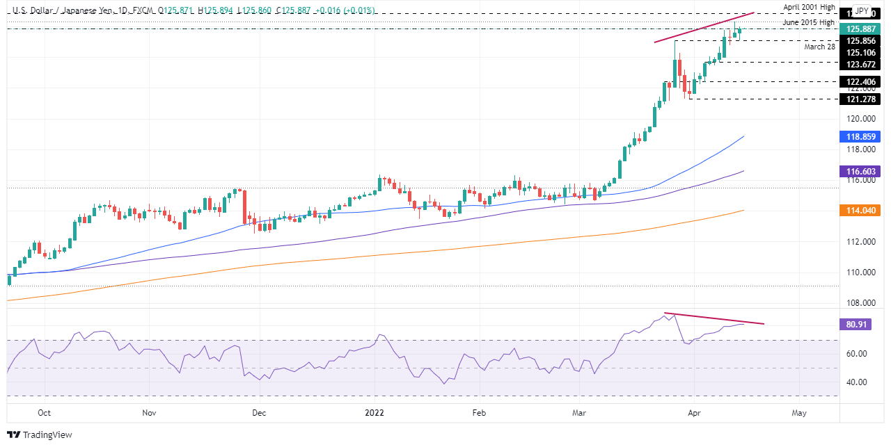 USD/JPY price portrays an inverted hammer followed by a regular hammer in an uptrend in the daily chart, meaning the uptrend is overextended. The Relative Strength Index (RSI) at 80.91 reached a lower high while the USD/JPY reached a new YTD high at 126.31, meaning a negative divergence is forming.