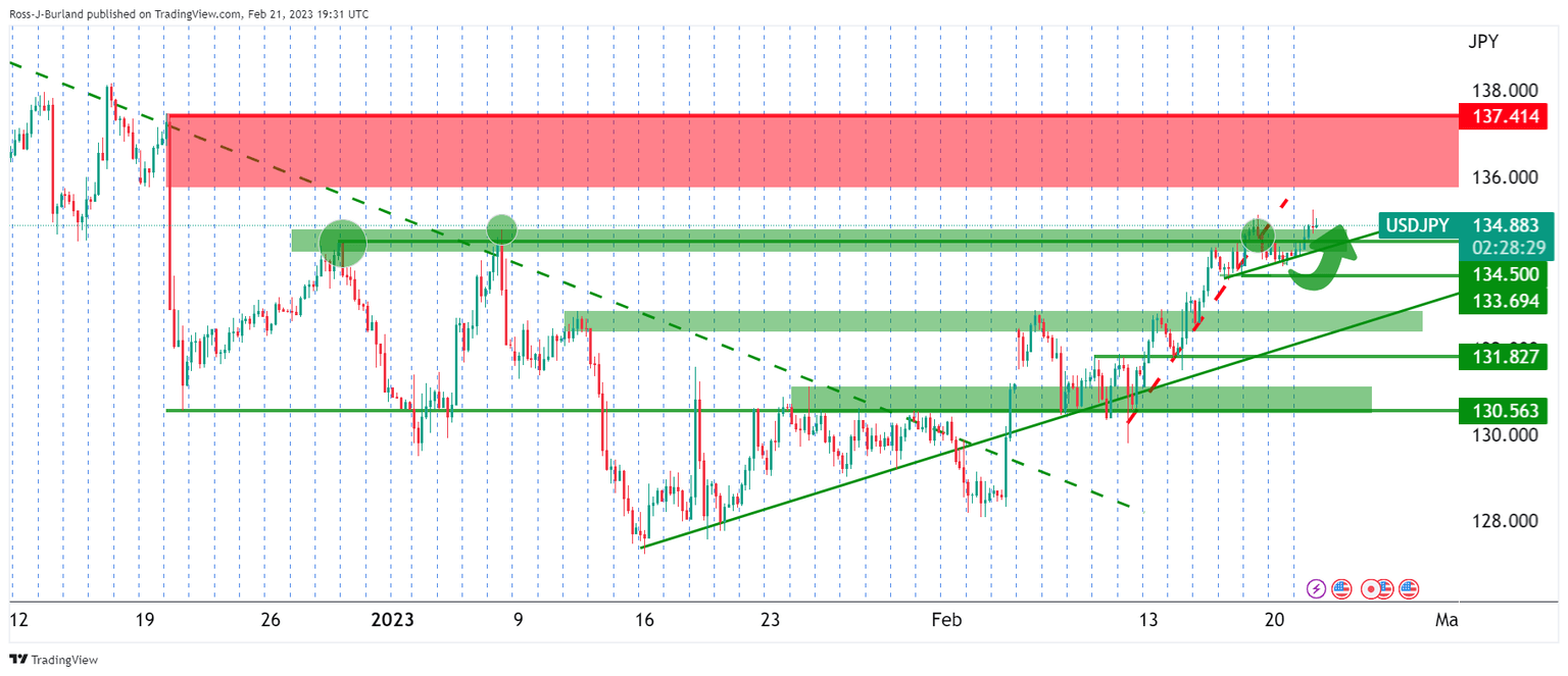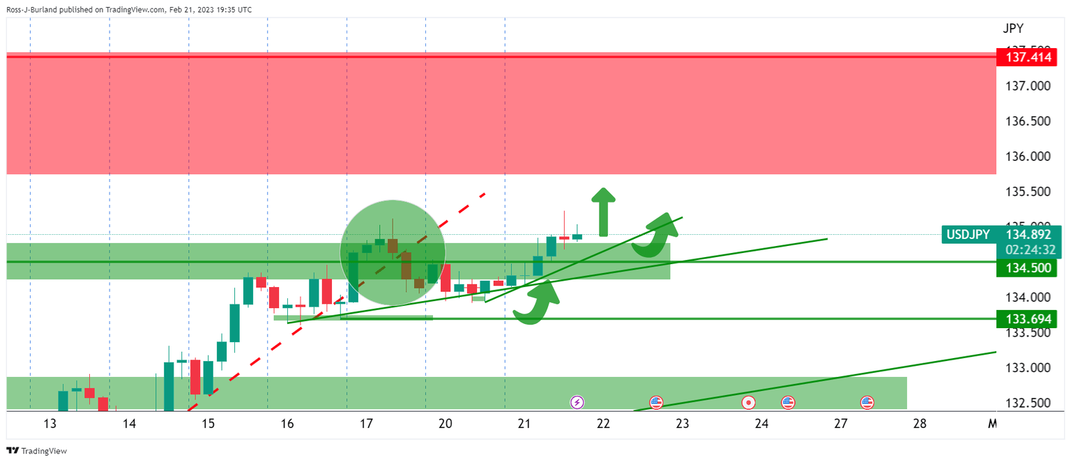 At the time of writing, USD/JPY is trading at 134.98 and has travelled between a low of 134.14 and a high of 135.22 so far. The US Dollar has been offering good two-way business on the day in volatile trading. However, the dominant theme remains an inflationary one and that is fueling the bid in the middle of the US session following yet more positive US economic data.