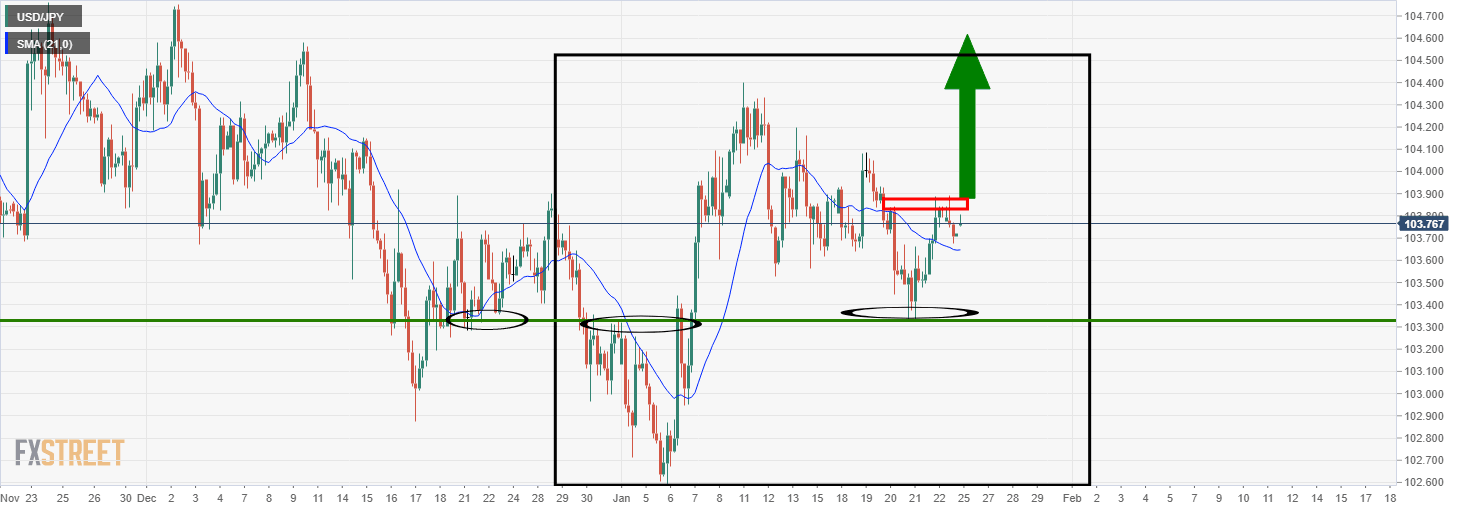 USD/JPY bulls pressure a critical resistance in 103.90 but lack conviction