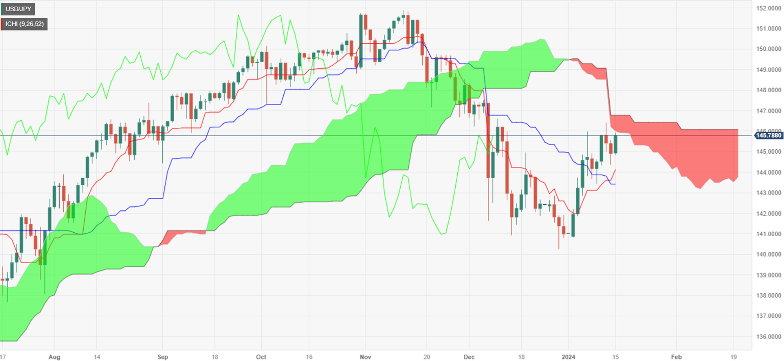 The daily chart portrays the pair at the brisk of shifting bullish, as the USD/JPY spot price is near the bottom of the Ichimoku Cloud (Kumo). A breach above the 146.00 figure and the Senkou Span B at 146.07 could pave the way for further upside at the top of the Kumo at 146.77, followed by the 147.00 figure. Once surpassed, the next resistance would emerge at 148.00. On the opposite front, sellers need to drag prices below the January 12 low of 144.34, which could pave the way toward 144.00, but firstly, it would face the Tenkan-Sen at 144.13.