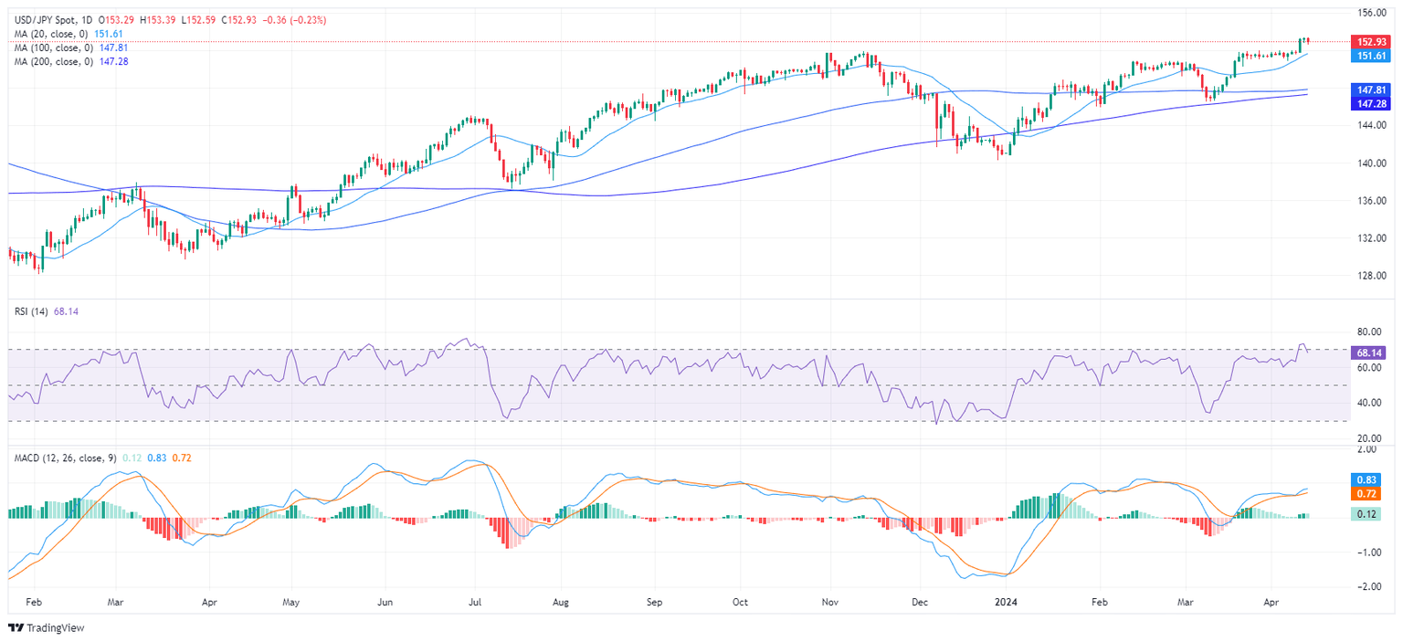 The USD/JPY pair, currently trading at 152.95 with a modest loss of 0.17%. Despite a drop in consumer confidence in the US, indicated by the University of Michigan's (UoM) Consumer Sentiment Index the Greenback will close a winning week, on the back of hot inflation data reported on Wednesday and Thursday.