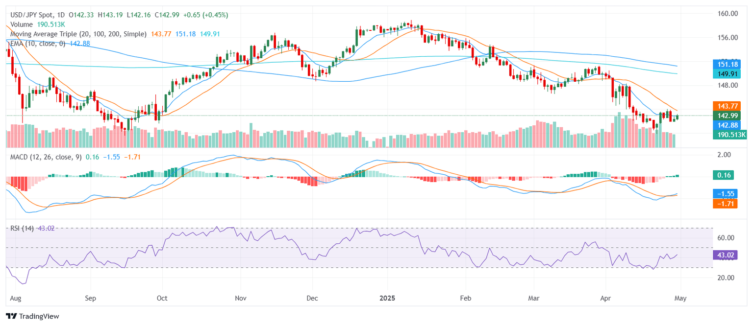 The USD/JPY is trading with modest losses, hovering near the mid-143.00s after disappointing US growth data and lackluster Japanese economic reports fueled diverging sentiment around both currencies. The US economy contracted by 0.3% in the first quarter of 2025, the first decline since 2022, missing expectations for growth and highlighting the impact of higher imports and reduced government spending. At the same time, Japan reported weaker-than-expected industrial production and retail sales, which limited the Yen’s upside even as global risk appetite faltered.