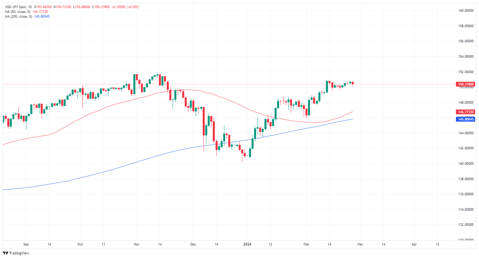 USD/JPY sees near-term technical resistance from 150.75 as the pair struggles to mount the 151.00 handle. The pair remains capped into the midrange as markets churn, and 150.50 remains a key cycle level for USD/JPY.