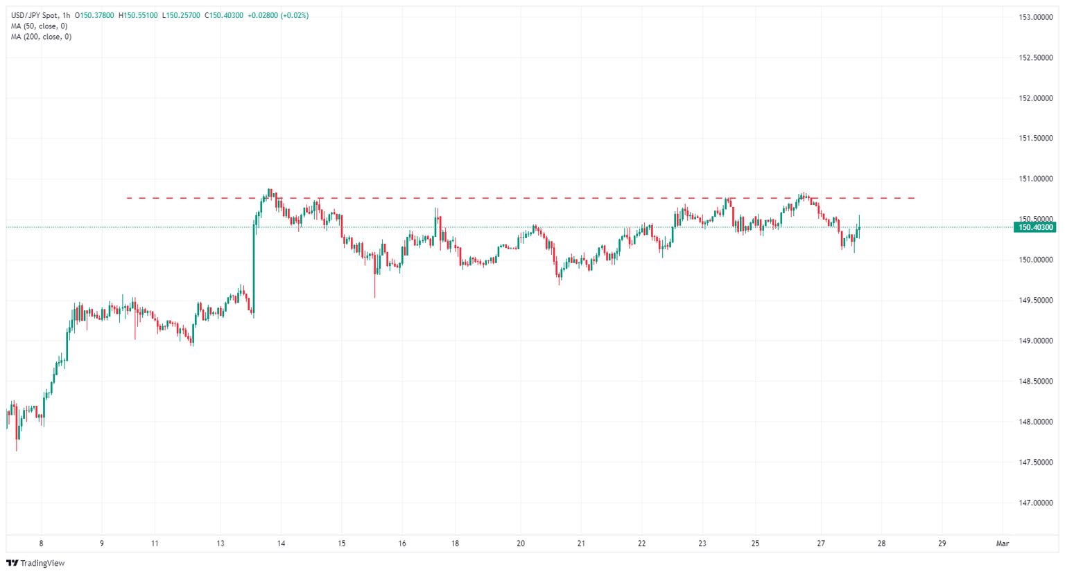 USD/JPY fell early Tuesday before finding a floor near 150.20, with the US Dollar (USD) paring away near-term losses after US Durable Goods Orders declined more than expected in January. Markets will be pivoting to focus on US Gross Domestic Product (GDP) growth and Personal Consumption Expenditure Price Index (PCE) inflation data due on Wednesday and Thursday, respectively.