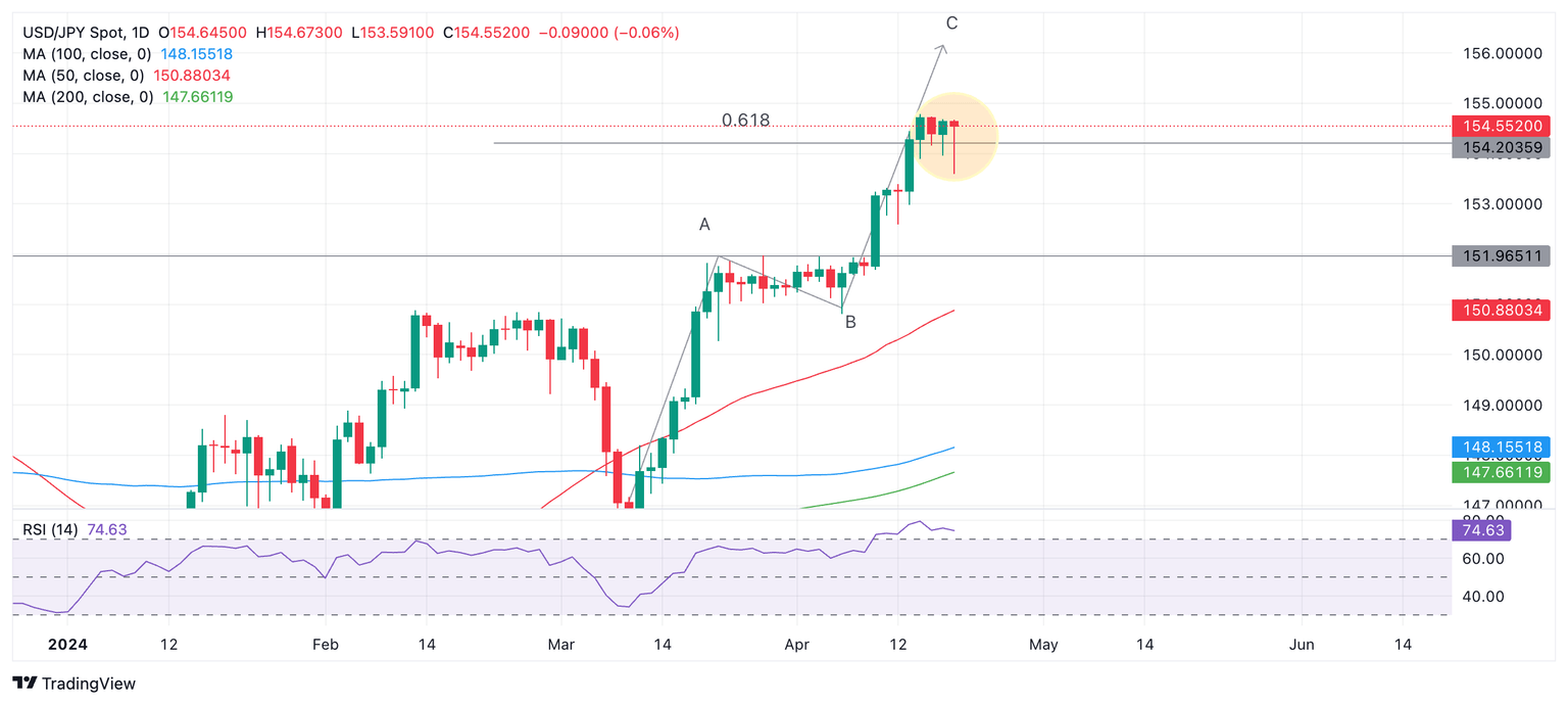 USD/JPY has already reached the conservative estimate for the end of wave C at the Fib. 0.618 extension of A, at 154.20. This means there is a possibility C may have reached its limit and the Measured Move could be complete.