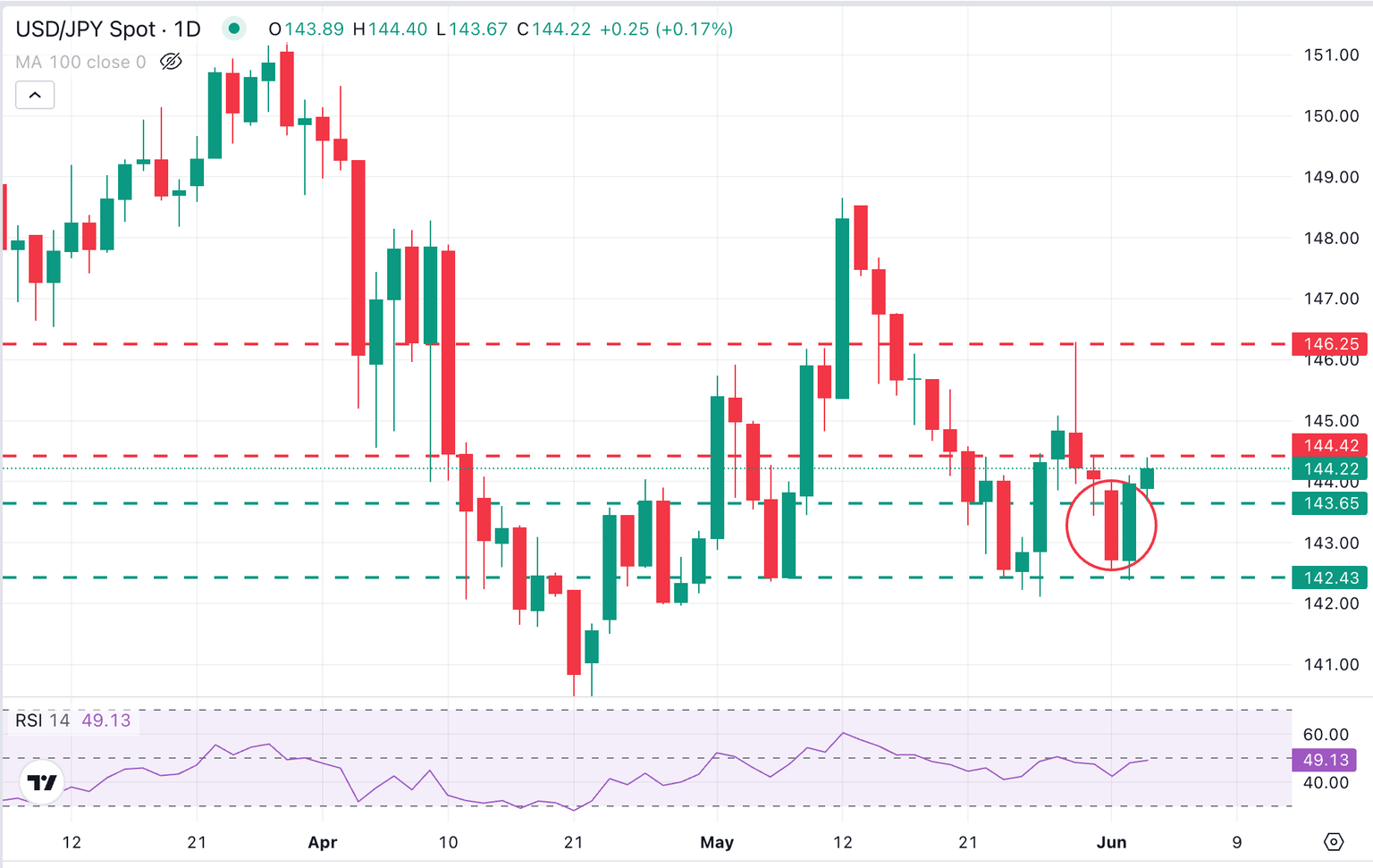 The US Dollar’s recovery from Monday’s lows has lost steam during Wednesday’s European trading session. The USD/JPY 4-hour chart shows doji candles at the 144.00 level, highlighting an indecisive market.