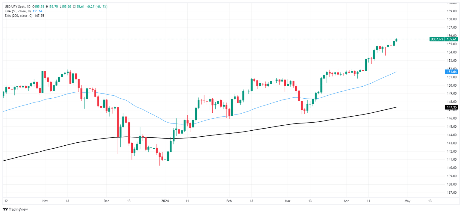 USD/JPY is trading tightly just below the 156.00 handle, hugging multi-year highs as the Yen continues to deflate. The pair is trading into 30-plus year highs, and bullish momentum is targeting all-time record bids beyond 160.00, a price level the pair hasn’t reached since 1990.