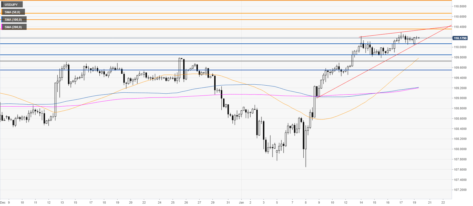 USD/JPY is consolidating its January spike above the 110.00 line and the main simple moving averages (SMAs). The market is trading near its highest since mid-May 2019.