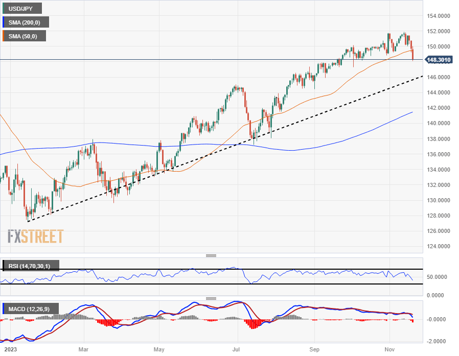 The USD/JPY is seeing further declines on Monday, with the Japanese Yen (JPY) gaining over a full percent against the US Dollar (USD). The pair has backslid from the 150.00 handle and is currently aimed at the sub-148.00 chartspace.