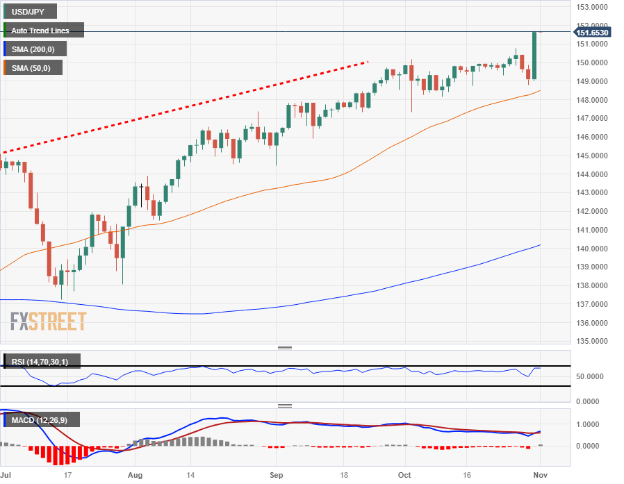 The Yen's deflate on Tuesday has sent the USD/JPY surging, and the pair is resting some 20-odd pips from setting a fresh 30-year high beyond 151.94, a previous record ceiling set back in October of 2022.