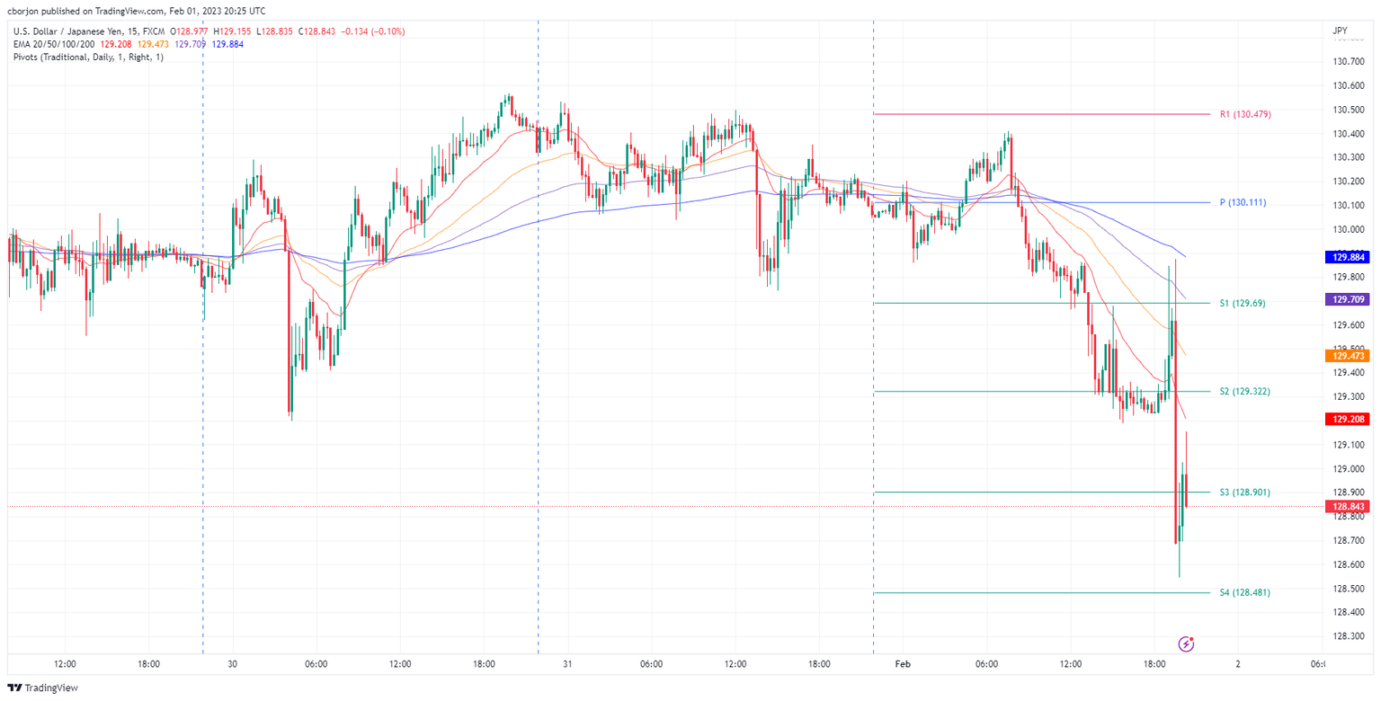 USD/JPY is plummeting sharply after the US Federal Reserve decided to slow down the pace of rate increases and hiked rates by 0.25% on their first monetary policy meeting of 2023. Therefore, the US 10-year Treasury bond yield is plunging more than ten bps toward 3.40% as the market responds to the Fed’s decision and Powell’s speech. At the time of writing, the USD/JPY exchanges hands in a volatile session at around 128.50-129.20.
