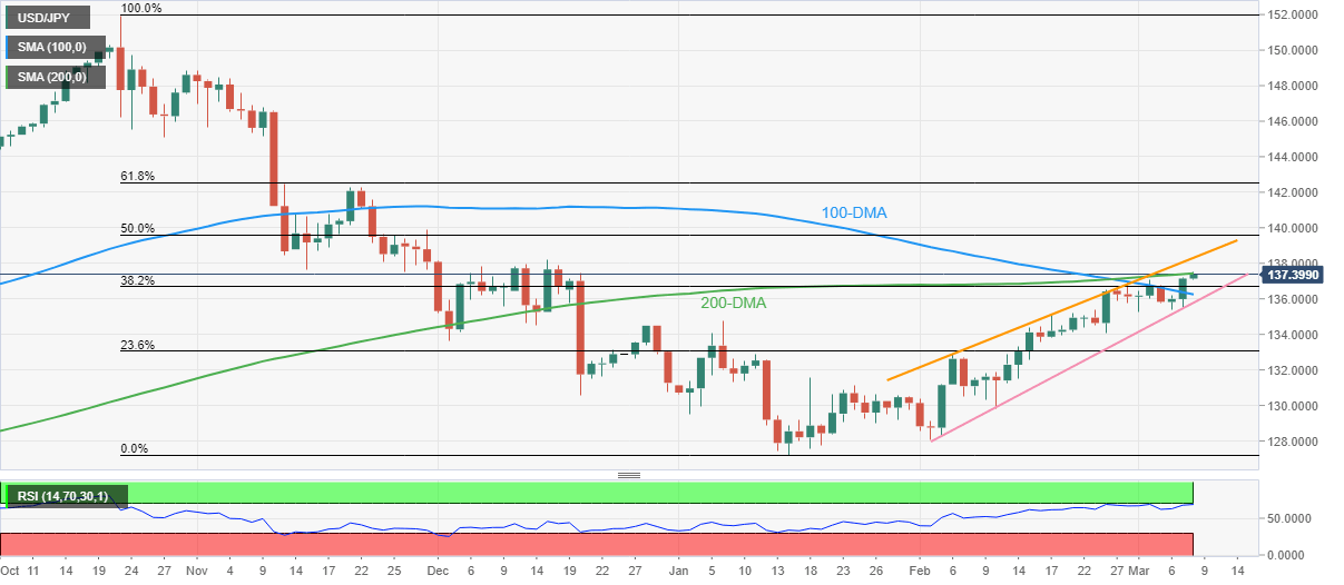 USD/JPY buyers occupy the driver’s seat even as markets remain calm during early Wednesday, following a volatile end to Tuesday’s trading session. In doing so, the Yen pair makes rounds to the 137.40-50 area after rising to the highest levels since mid-December 2022.