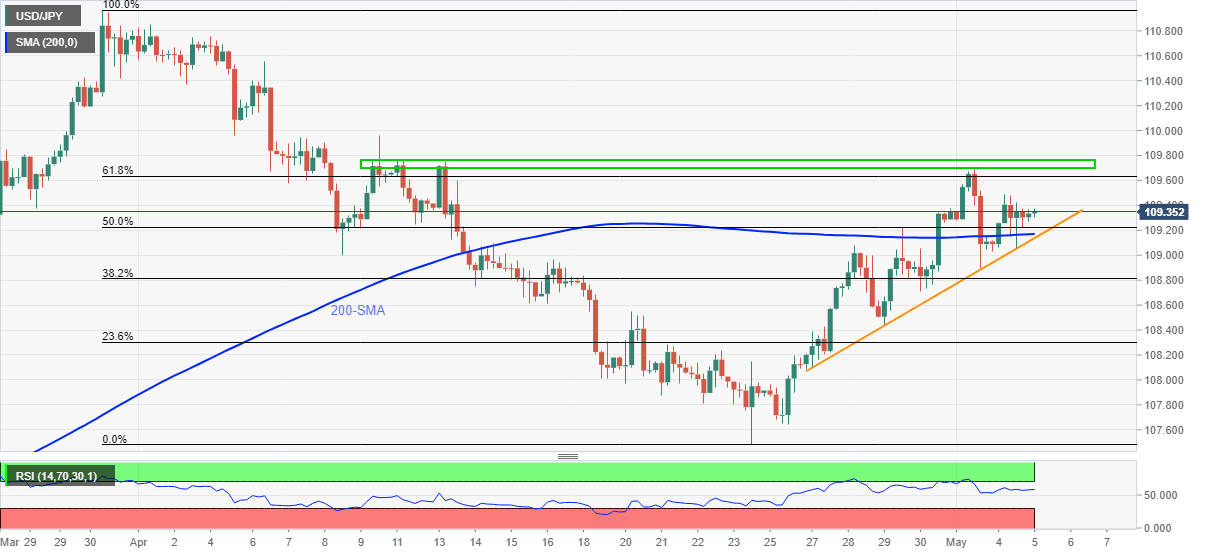 USD/JPY eases to 109.35, revisiting the day’s opening levels, amid early Wednesday. Even so, the yen pair remains above 200-SMA and an ascending support line from April 26 to keep the buyers hopeful amid a quiet session in Asia, mainly due to holidays in China and Japan.
