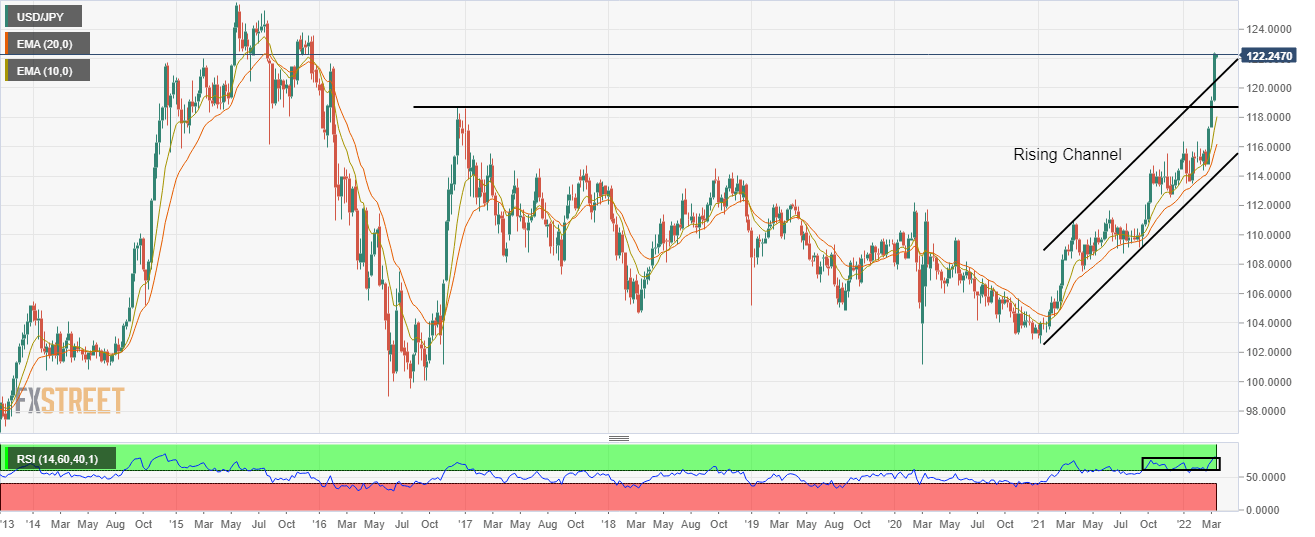 On the weekly scale, USD/JPY has witnessed a juggernaut rally after a breakout out of the rising channel on the upside. The upper end of the rising channel is placed from 2 April 2021 high at 110.97 while the lower end is marked from 8 January 2021 low at 102.59. Moreover, the asset has also surpassed its five-year-old resistance at 118.66.
