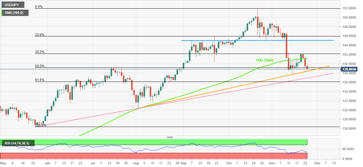 USD/JPY stands on the slippery ground as it renews its weekly low near 138.80 during early Thursday. In doing so, the Japanese Yen (JPY) pair drops for the third consecutive day after reversing from the 38.2% Fibonacci retracement level of the May-October upside.