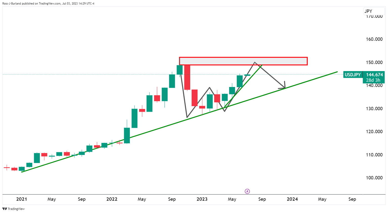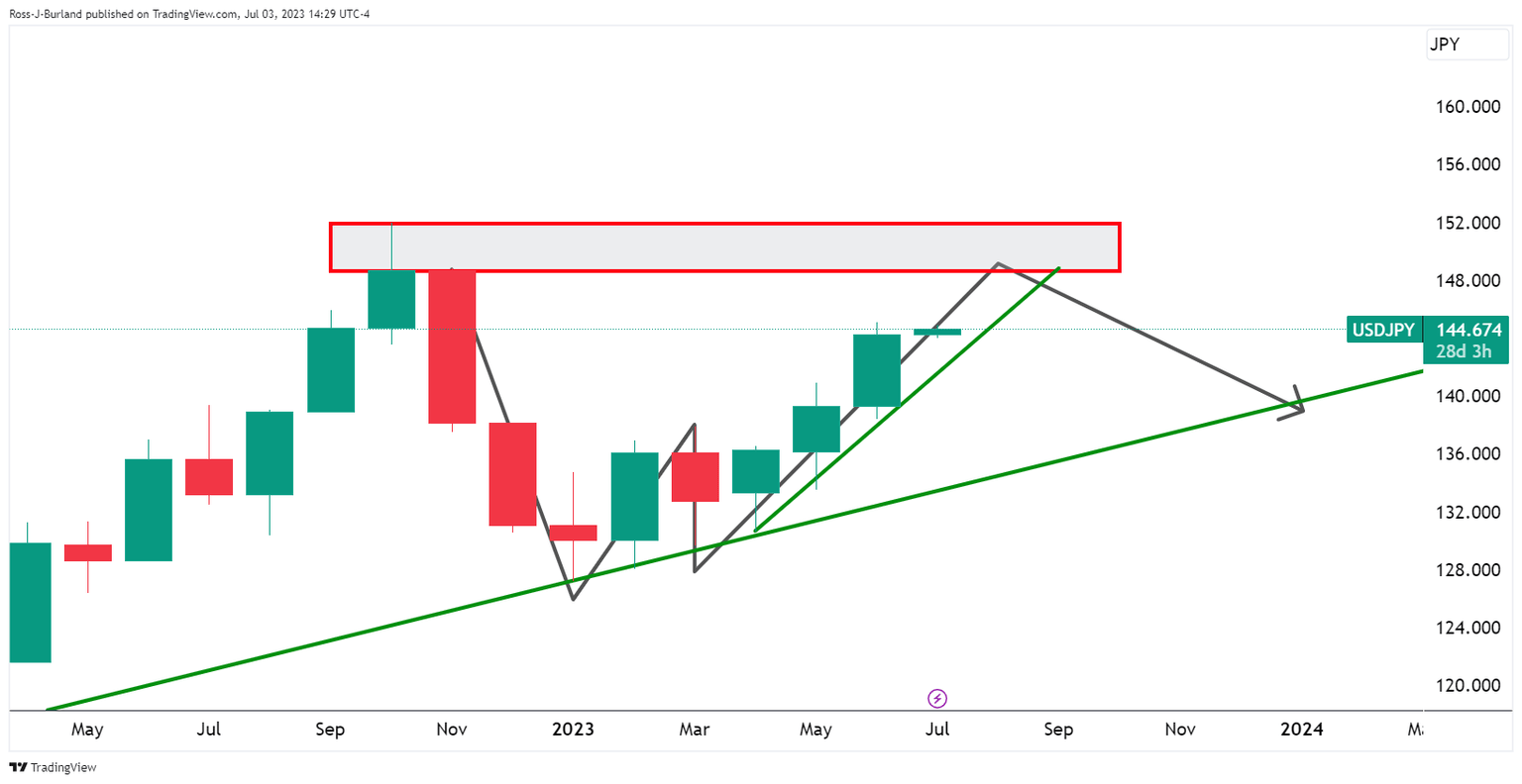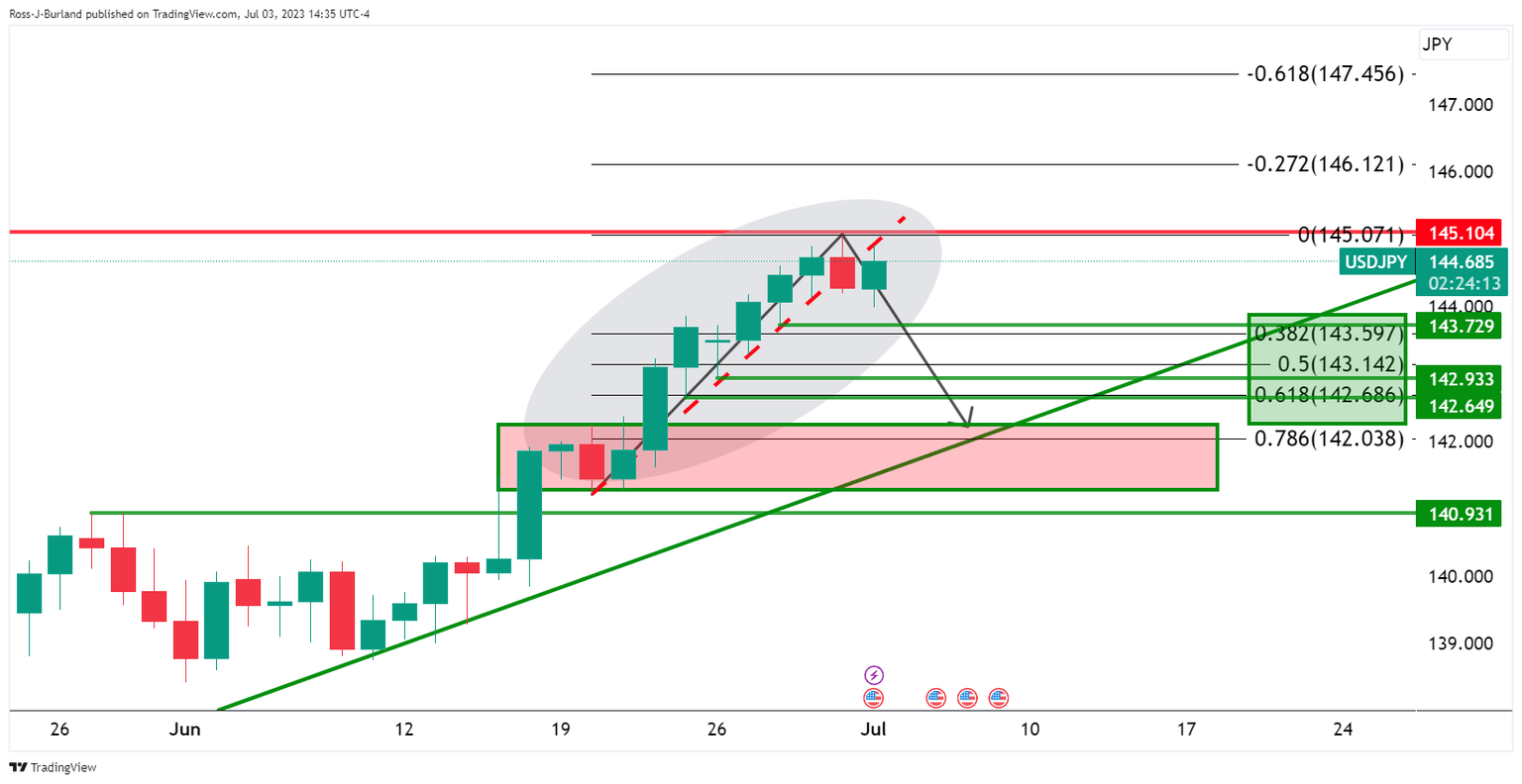 USD/JPY is up some 0.3% on the day trading at around 144.70 having travelled up from a low of 143.98 to a high of 144.91 so far. at this juncture, the Yen that's under intervention watch after the Japanese finance minister warned last week of excessive moves in the currency market.