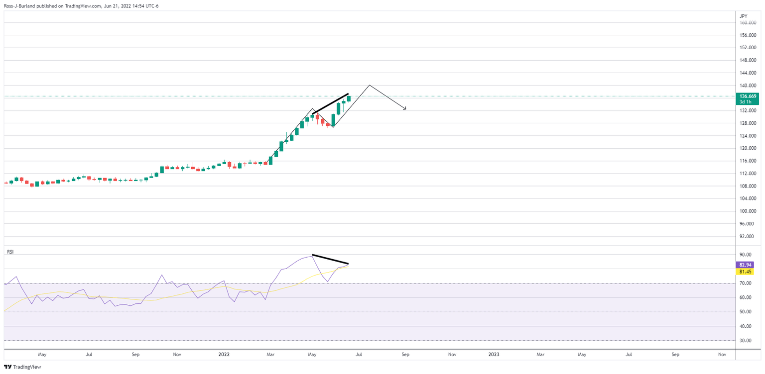 With the divergence between the Bank of Japan and the Federal Reserve, the yen has been crushed to multi-year levels and the following illustrates the prospects of a move even lower according to the monthly structure: