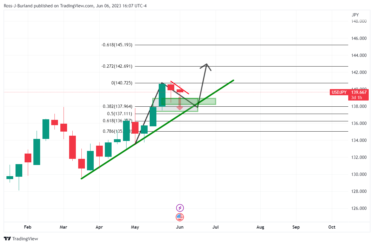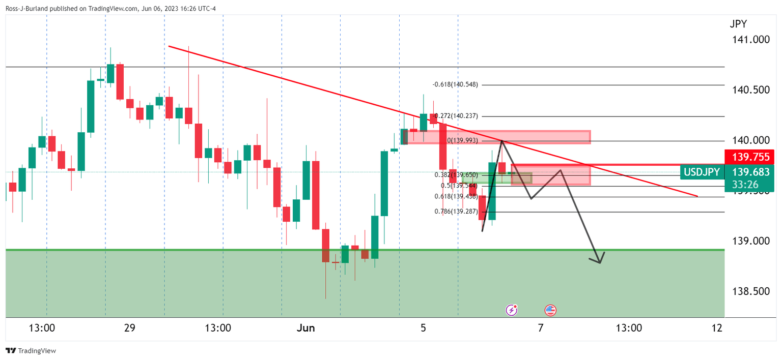 The Bears are flexing but need to do more. On the 4-hour chart, we can see prospects of a correction of the midday London spike. A move below support to target, say, the 61.8% Fibonacci could be encouraging and motivating the bears to commit below 139.70.