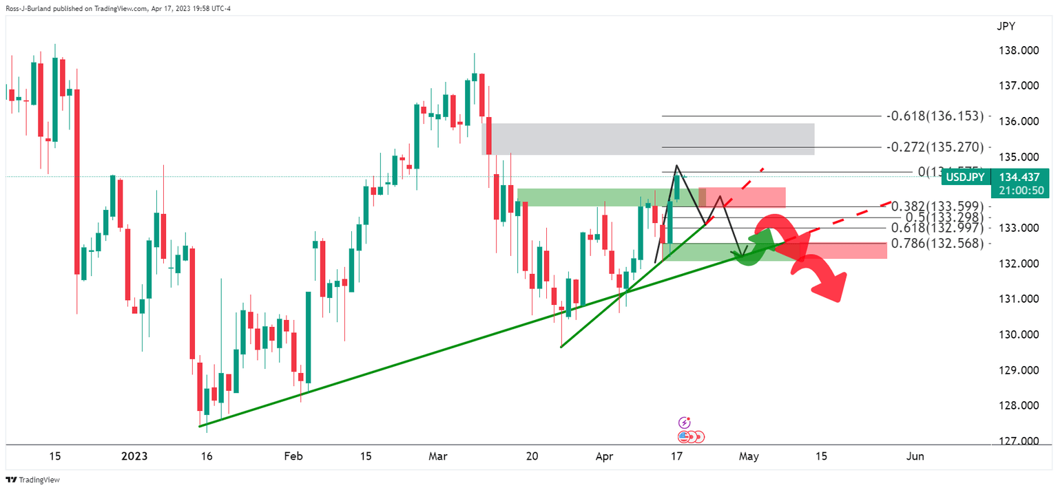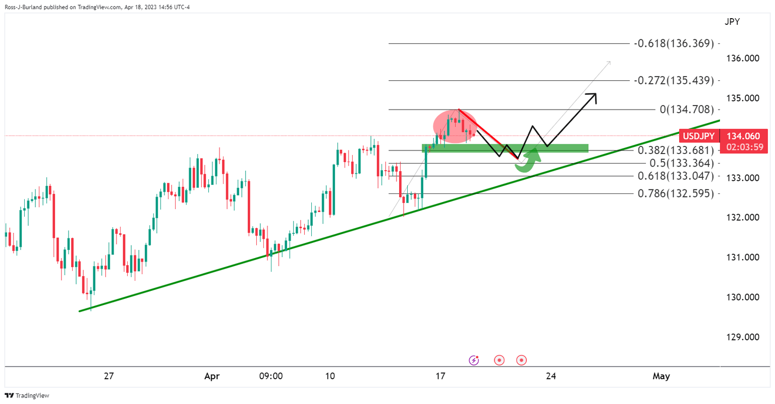 As per the prior analysis, USD/JPY Price Analysis: Bulls stay front side of trend and above the 134 figure but correction eyed, the correction is underway. The following illustrates the prospects of a bullish continuation following a move into the in-the-money longs: