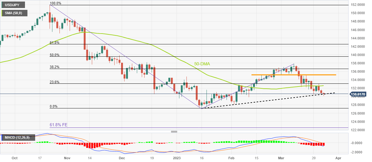 USD/JPY licks its wounds near 130.60, after refreshing a 1.5-month low, during a three-day downtrend on early Friday. In doing so, the Yen pair sellers attack the support line stretched from early January while extending the mid-week pullback from the 50-DMA.