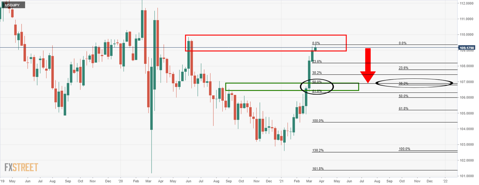USD/JPY bears could be about to break up the bull's relentless run on the longer-term time frames and the following top-down analysis illustrates where the downside target could come in.