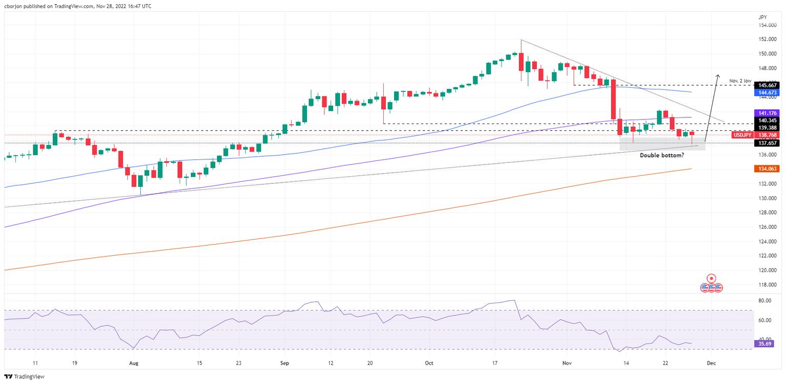 After testing during the last month, the 137.00 mark, the USD/JPY rebounded strongly, reclaiming the 138.00 figure, signaling that buyers stepped in. A possible formation of a “double bottom” chart pattern around 137.50/60 could open the door for a recovery, which could target the 50-day Exponential Moving Average (EMA) at 144.67, as the initial target, on its way to 147.00. Notably, the Relative Strength Index (RSI) remained unchanged as the USD/JPY price action dived toward a multi-month low. Hence, a positive divergence between RSI and price action could pave the way for further USD/JPY upside.