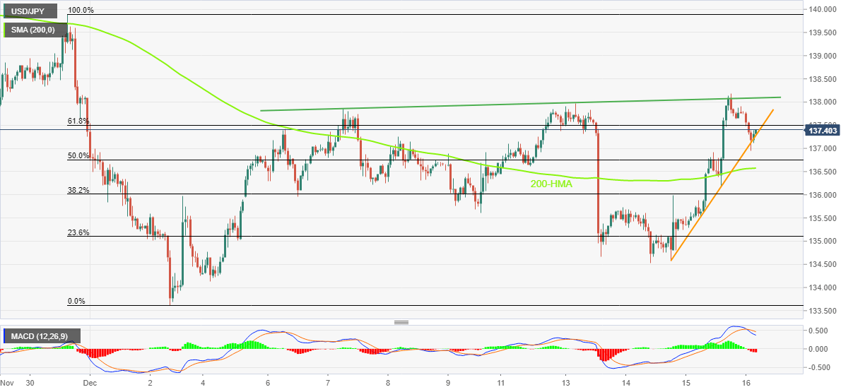 USD/JPY picks up bids to 137.40 as it pares intraday losses during early Friday morning in Europe. In doing so, the Yen pair bounces off an upward-sloping support line from Tuesday.