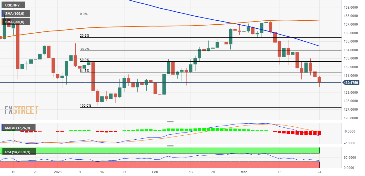 The USD/JPY pair remains under heavy selling pressure for the third successive day and touches its lowest level since February 03, around the 129.65 region on Friday. Spot prices, however, trim a part of the intraday losses and trade just above the 130.00 psychological mark during the early North American session, still down nearly 0.50% for the day.