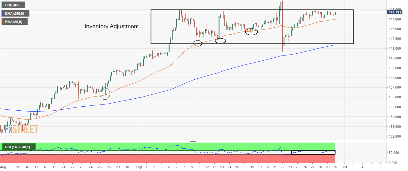 The USD/JPY pair is displaying a slowdown in the upside momentum after reaching around 144.80 in the Tokyo session. Earlier, the asset rebounded firmly after dropping to near 144.30. Broadly, the major is displaying topsy-turvy moves as investors are awaiting a potential trigger for informed action.