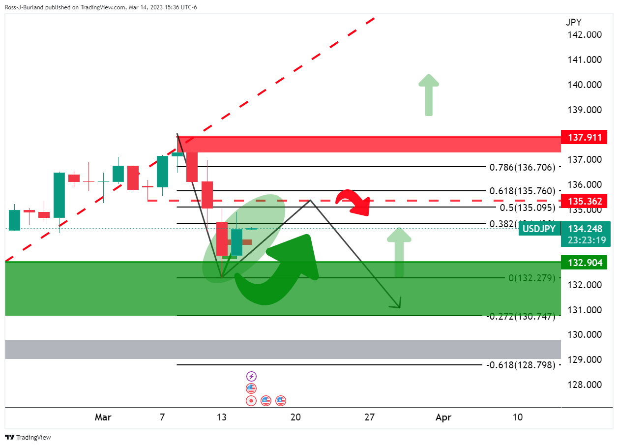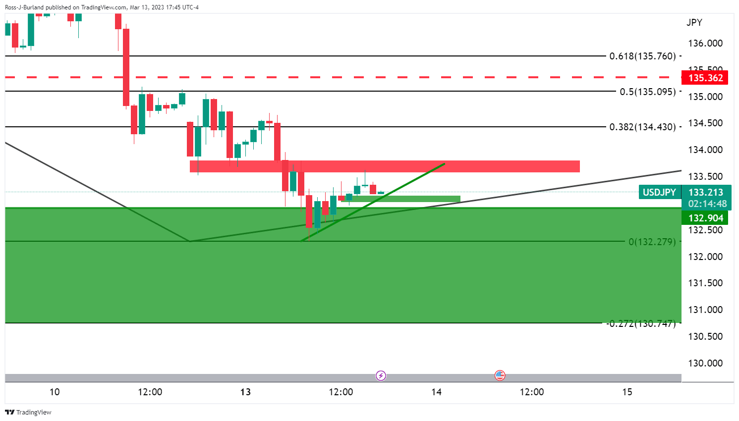 It was stated, that ´´on a daily basis, USD/JPY is moving into a support zone that could result in a correction ahead of the US CPI data with the 134.50-70 eyed as per the daily Fibonacci scale as illustrated above. However, on a lower time frame:´´