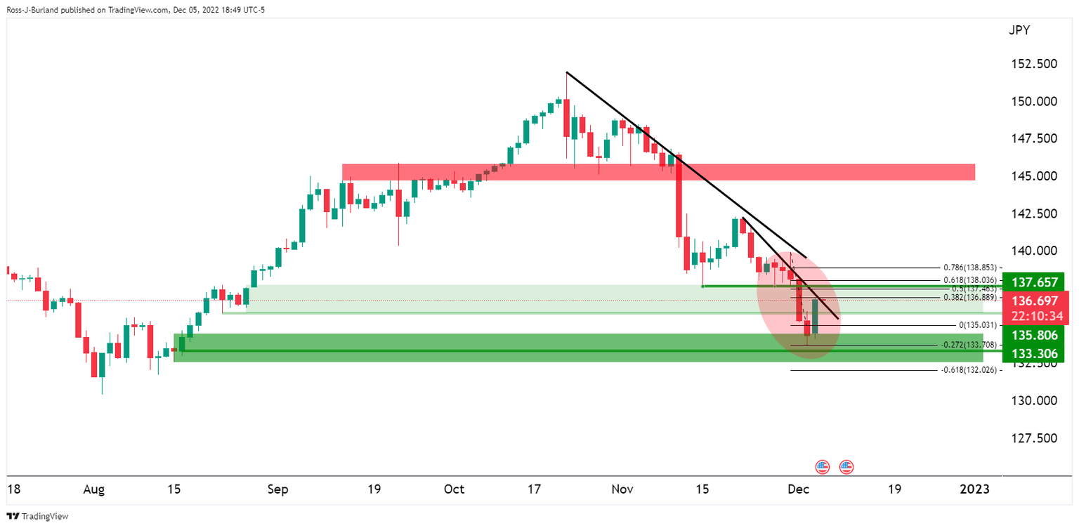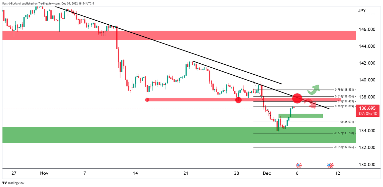 The price could now be embarking on a move beyond 138.00 but resistance needs to give. While on the front side of the micro trendlines, the bias remains bearish and a fade on rallies could be in store.